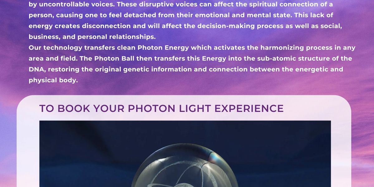 Our technology transfers clean Photon Energy witch activates the harmonizing process in the field. The Photon Ball than transfers this energy into sub-atomic structure of the DNA, restoring the original genetic information and connection between the energetic and physical body.